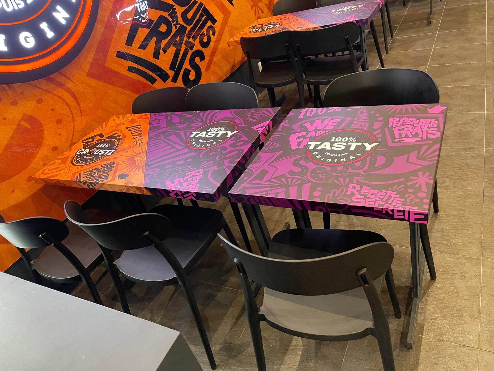 Quand on parle de vitrophanie, on pense souvent aux vitrines… pourtant, son potentiel va bien plus loin. Aujourd’hui, elle s’invite directement au cœur des établissements, notamment dans les restaurants et fast-foods, pour créer des univers visuels forts et immersifs.
